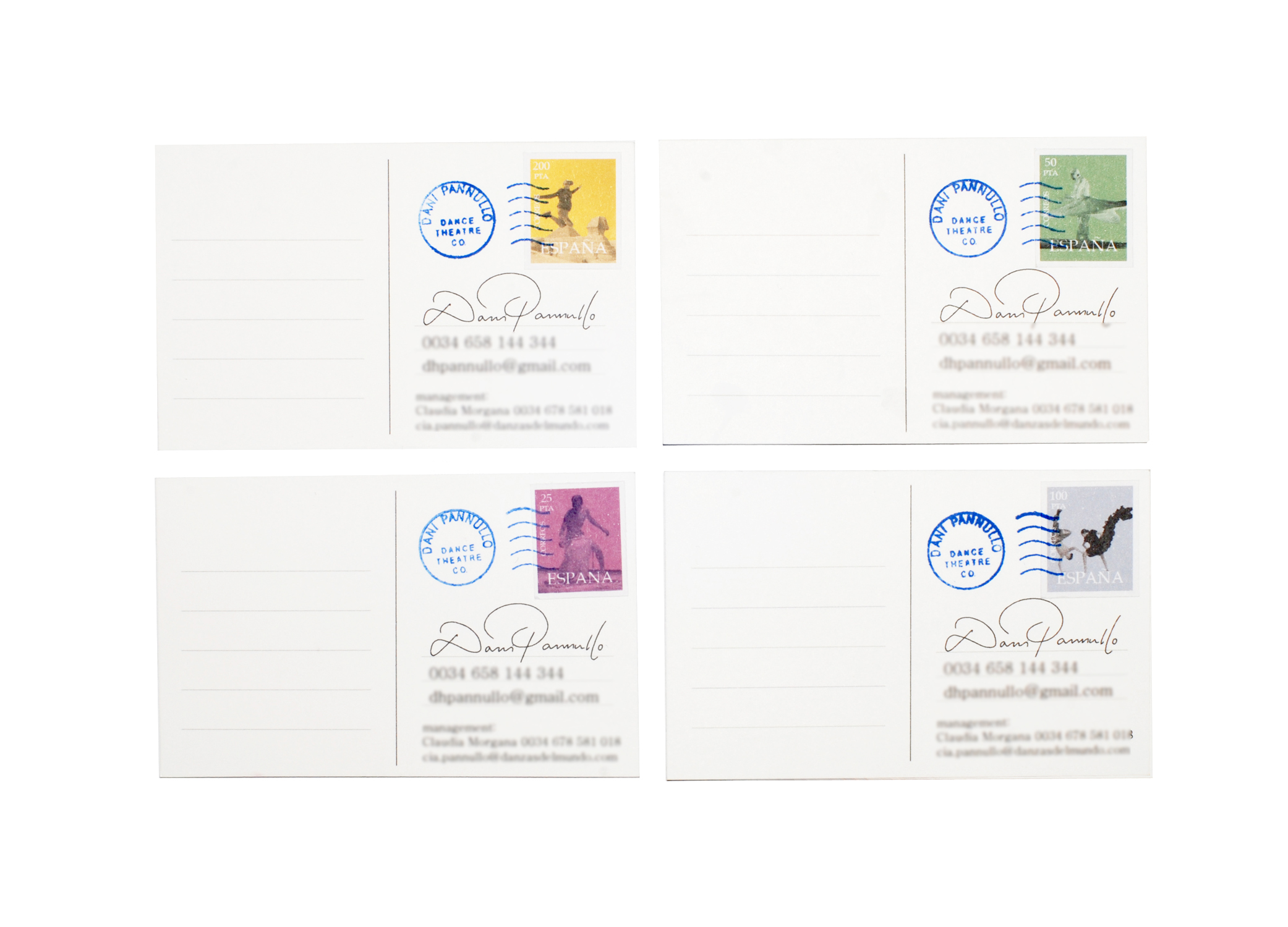 Diseño de tarjetas personales. El cliente es coreógrafo y viaja mucho por el mundo. Quiere que sus tarjetas se recuerden como las postales que él ha ido coleccionando en sus viajes.