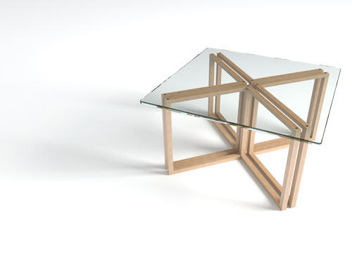 Mesa realizada con madera o acero, y sobre de vidrio. La mesa son dos mesas en una. El diseño se ha desarrollado para que pueda duplicarse la superficie total de la mesa, utilizando dos patas de las cuatro para cada mesa.